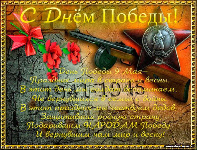 Май в цветах, салют взлетает ввысь, В праздник всюду радость, поздравления! Пусть всегда успешной будет жизнь! С Днём Победы! Счастья и везенья!